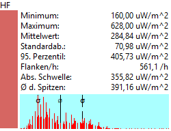 Dann wird der Verlauf der Feldstärke analysiert und der Mittelwert und das Maximum bestimmt.